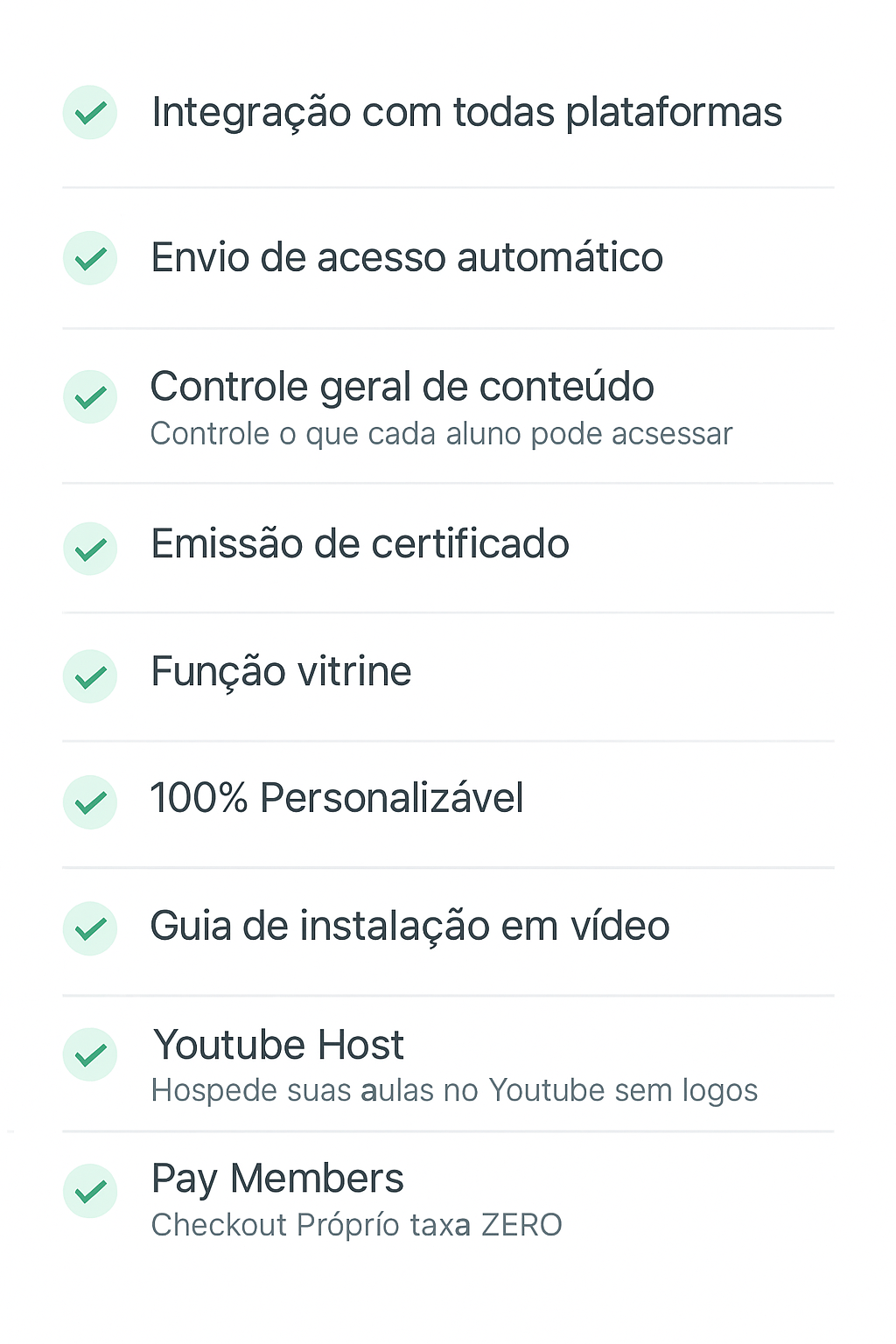 Controle o que cada aluno poderá ter aceso de forma simples e automática, mantendo conteúdos bloqueados com links para compra e desbloqueio dentro da própria área